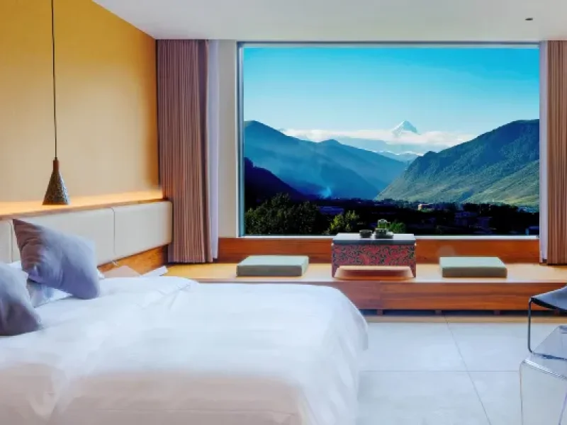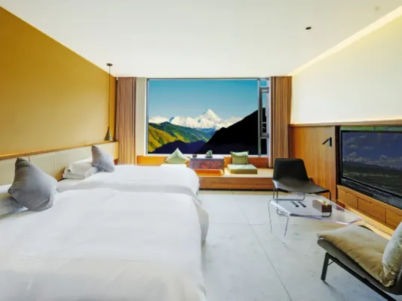 The hotel is located on the Gongga Snow Mountain Observation Deck in Xinduqiao Town, covering an area of ​​30 acres. All rooms face the main peaks of Gongga, and all rooms are over 50 square meters in size, with large French windows, and a manor-style viewing hotel.