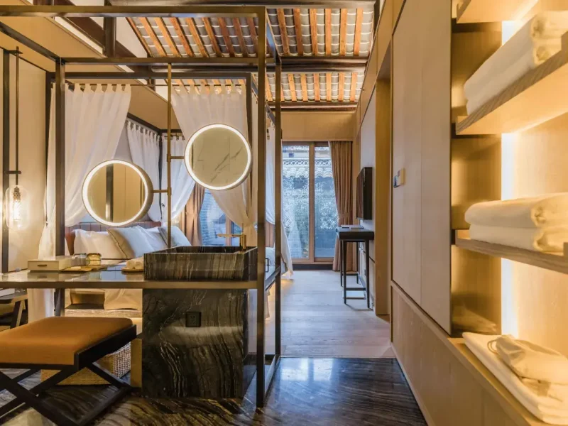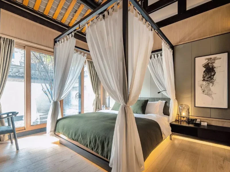 The hotel’s house was the residence of Mr. Li Zhuxi, Ba Jin’s grandfather. It is elegant and handsome, with unique charm, blue bricks and stone tiles, pavilions and waterside pavilions, which complement each other. The hotel’s five suites are named after the traditional Chinese five colors of emerald, green, dark blue, rouge and blue. The layout is spacious and transparent, with calm and heavy colors. The rooms are equipped with central air conditioning, floor heating, Salvatore Ferragamo toiletries, and German Duravit bathroom series, creating a noble bathroom enjoyment and a comfortable sleeping space for you.
